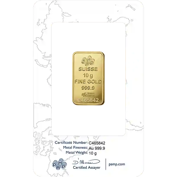 Our stunning PAMP 10g PAMP Branded Rosa gold bars are renowned for their high quality and sleek design. With LBMA (London Bullion Market Association) approval and 99.99% purity, these are fantastic products for collectors and investors. These 24 Carat 10g gold bars come in a sleek credit card-sized package.