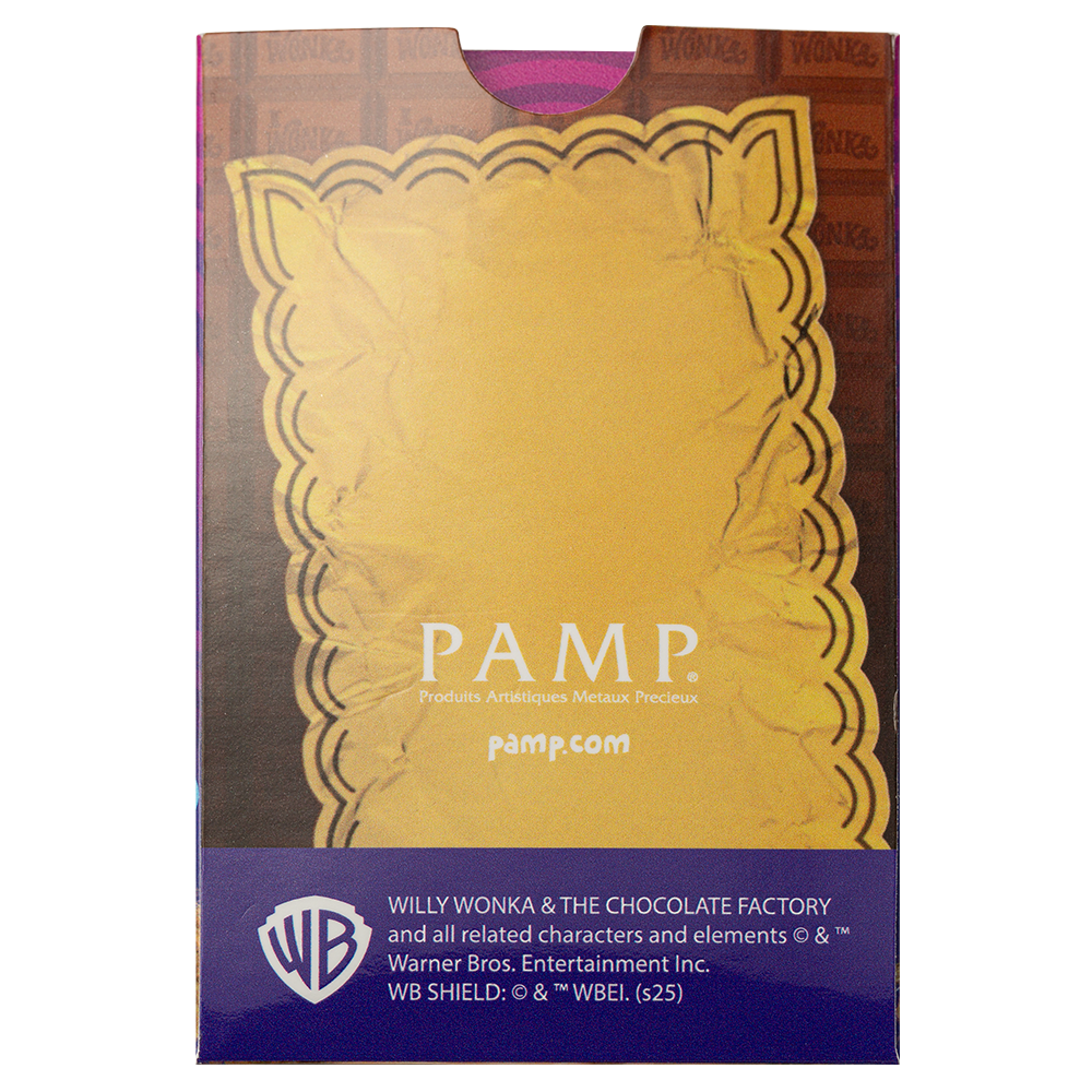Introducing our exquisite 5 gram PAMP Willy Wonka Chocolate Design pure gold bar. Inspired by Roald Dahl’s timeless 1964 classic Charlie and the Chocolate Factory and the iconic 1971 film Willy Wonka and the Chocolate Factory, this officially licensed collectible celebrates the legendary Golden Ticket, the gateway to a world of dreams, sweets, and wonder.